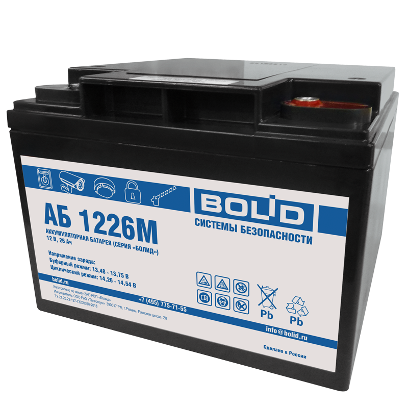 Свинцово-кислотный аккумулятор Болид 1226М производится напряжением 12 В и ёмкостью 26 Ач. Корпус выполнен из ударопрочного кислотостойкого ABS-пластика и надёжно герметизирован. Внутри поддерживается давление, необходимое для протекание реакции рекомбинации газов. VRLA-клапан сбрасывает избыточное давление, обслуживать Болид 1226М не требуется. Срок службы при соблюдении правил эксплуатации составляет 15 лет. Батарея подходит как для циклического, так и буферного режима. Болид 1226М предназначен для работы в источниках бесперебойного и резервного питания, пожарной автоматике, систем видеонаблюдения и безопасности.