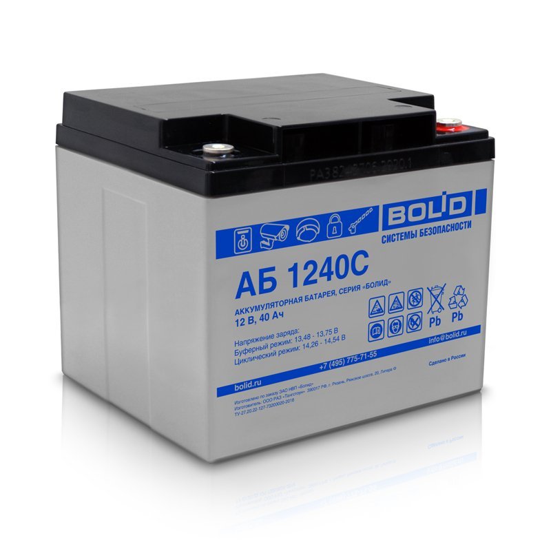 Свинцово-кислотный аккумулятор Болид 1240С производится напряжением 12 В и ёмкостью 40 Ач. Корпус выполнен из ударопрочного кислотостойкого ABS-пластика и надёжно герметизирован. Внутри поддерживается давление, необходимое для протекание реакции рекомбинации газов. VRLA-клапан сбрасывает избыточное давление, обслуживать Болид 1240С не требуется. Срок службы при соблюдении правил эксплуатации составляет 12 лет. Батарея подходит как для циклического, так и буферного режима. Болид 1240С предназначен для работы в источниках бесперебойного и резервного питания, пожарной автоматике, систем видеонаблюдения и безопасности.