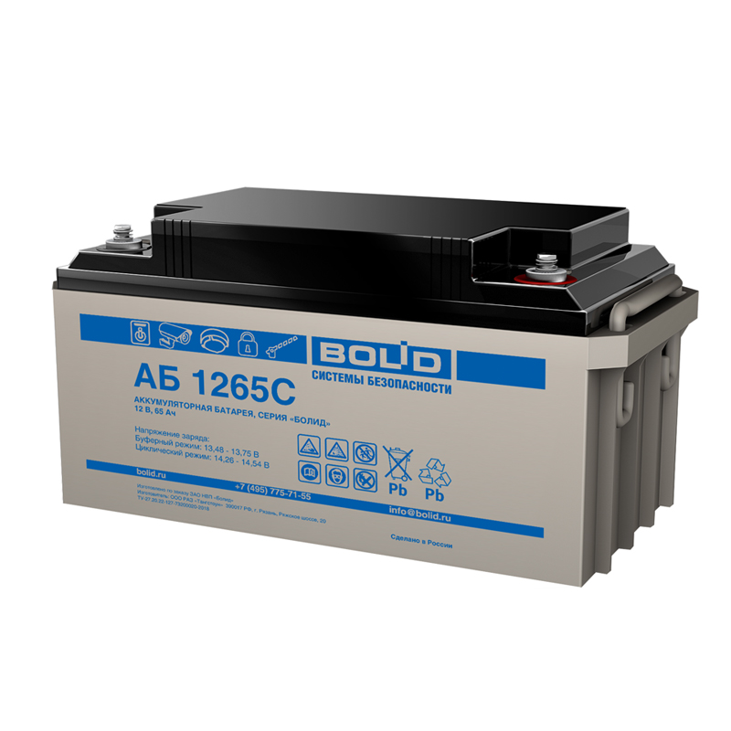 Свинцово-кислотный аккумулятор Болид 1265С производится напряжением 12 В и ёмкостью 65 Ач. Корпус выполнен из ударопрочного кислотостойкого ABS-пластика и надёжно герметизирован. Внутри поддерживается давление, необходимое для протекание реакции рекомбинации газов. VRLA-клапан сбрасывает избыточное давление, обслуживать Болид 1265С не требуется. Срок службы при соблюдении правил эксплуатации составляет 12 лет. Батарея подходит как для циклического, так и буферного режима. Болид 1265С предназначен для работы в источниках бесперебойного и резервного питания, пожарной автоматике, систем видеонаблюдения и безопасности.