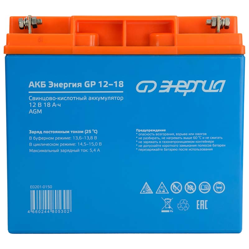 Свинцово-кислотный аккумулятор Энергия GP 12–18 производится напряжением 12 В и ёмкостью 18 Ач по технологии AGM. Стекловолоконный сепаратор обеспечивает неподвижность электролита, что положительно сказывается на характеристиках батареи. Срок службы при соблюдении правил эксплуатации достигает 6 лет в буферном режиме. Энергия GP 12–18 подходит для использования в источниках бесперебойного питания, охранной и пожарной сигнализации, систем связи и телекоммуникации. Корпус из ABS пластика прочный и надёжно герметизирован. На протяжении всего срока службы обслуживание (долив дистиллята) не требуется.