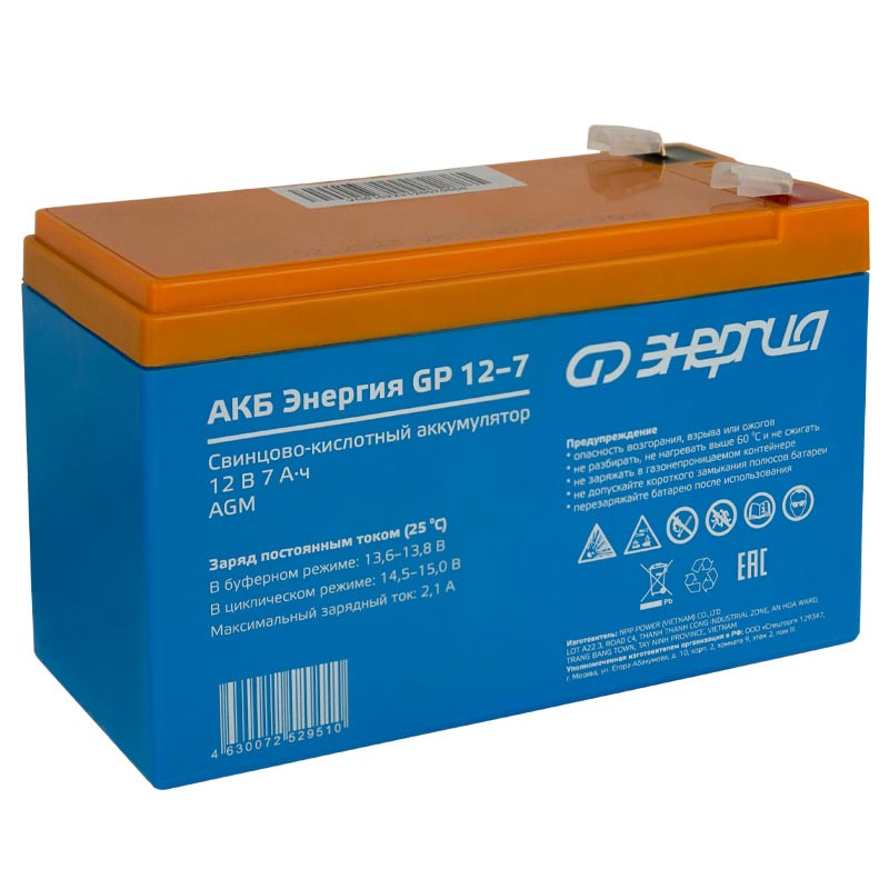 Свинцово-кислотный аккумулятор Энергия GP 12–7 производится напряжением 12 В и ёмкостью 7 Ач по технологии AGM. Стекловолоконный сепаратор обеспечивает неподвижность электролита, что положительно сказывается на характеристиках батареи. Срок службы при соблюдении правил эксплуатации достигает 6 лет в буферном режиме. Энергия GP 12–7 подходит для использования в источниках бесперебойного питания, охранной и пожарной сигнализации, систем связи и телекоммуникации. Корпус из ABS пластика прочный и надёжно герметизирован. На протяжении всего срока службы обслуживание (долив дистиллята) не требуется.