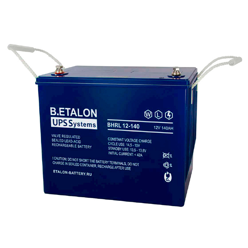 Свинцово-кислотный аккумулятор B.ETALON BHRL 12-140 выпускается ёмкостью 141 Ач и напряжением 12 В. Он может использоваться как в циклическом, так и в буферном режиме. Батарею можно использовать в источниках бесперебойного питания, медицинском оборудовании, ЦОД, системах связи и других подобных системах. B.ETALON BHRL 12-140 полностью герметичен, внутреннее давление регулируется специальным VRLA (Valve-Regulated Lead–Acid) клапаном. Благодаря нему внутри аккумулятора происходит рекомбинация газов и обслуживание на протяжении всего срока службы изделия (до 12 лет) не требуется. Продукт сертифицирован для использования на территории РФ и соответствует требованиям UL, IEC, Гост Р. Главная особенность линейки аккумуляторов B.ETALON повышенная энергоотдача. Она достигается благодаря специальной технологии изготовления свинцовых пластин.
