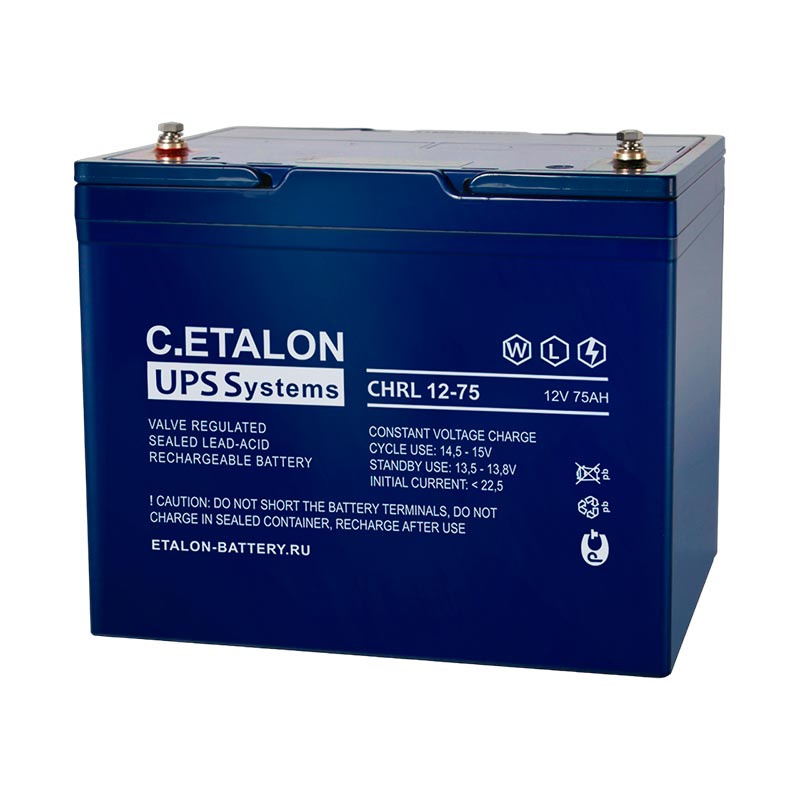 Свинцово-кислотный аккумулятор C.ETALON CHRL 12-75 выпускается ёмкостью 75 Ач и напряжением 12 В. Он может использоваться как в циклическом, так и в буферном режиме. Батарею можно использовать в источниках бесперебойного питания, медицинском оборудовании, ЦОД, системах связи и других подобных системах. C.ETALON CHRL 12-75 полностью герметичен, внутреннее давление регулируется специальным VRLA (Valve-Regulated Lead–Acid) клапаном. Благодаря нему внутри аккумулятора происходит рекомбинация газов и обслуживание на протяжении всего срока службы изделия (до 12 лет) не требуется. Продукт сертифицирован для использования на территории РФ и соответствует требованиям UL, IEC, Гост Р. Линейка C.ETALON отличается повышенными разрядными характеристиками. C.ETALON CHRL 12-75 спроектирована специально для источников бесперебойного питания.