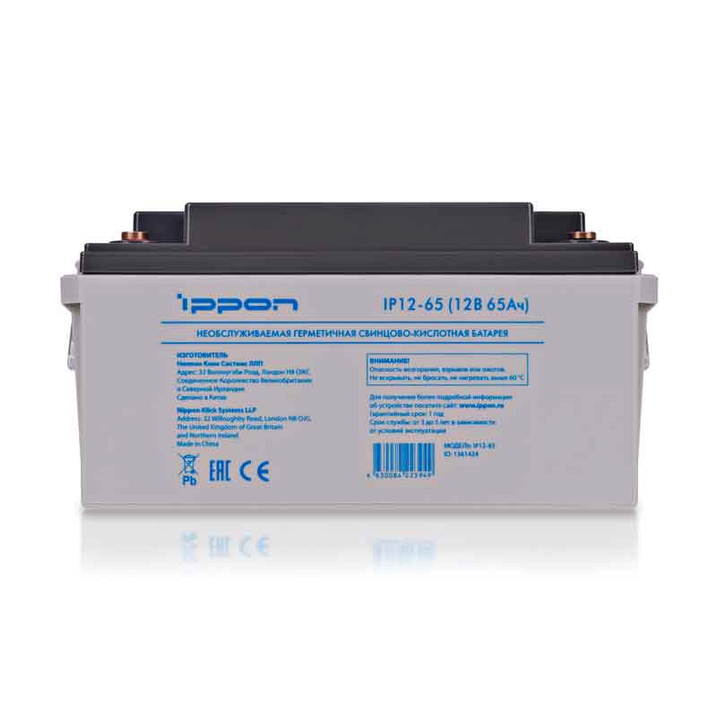 Свинцово-кислотный аккумулятор Ippon IP 12-65 (ёмкость 65 Ач, напряжение 12 В) производится с применением технологии AGM. Жидкий электролит удерживается в неподвижном состоянии внутри мелкопористых стекловолоконных сепараторов. Корпус из ABS-пластика полностью герметичен, внутри него поддерживается давление, необходимое для рекомбинации газов. Обслуживать Ippon IP 12-65 на протяжении всего срока службы не требуется. Для поддержания нужного давления используется односторонний VRLA клапан. Батарея используется в ИБП, телекоммуникациях, охранных и аварийных системах, в промышленных объектах. Дата производства аккумулятора Ippon IP 12-65 указана на крышке в виде символьного кода.