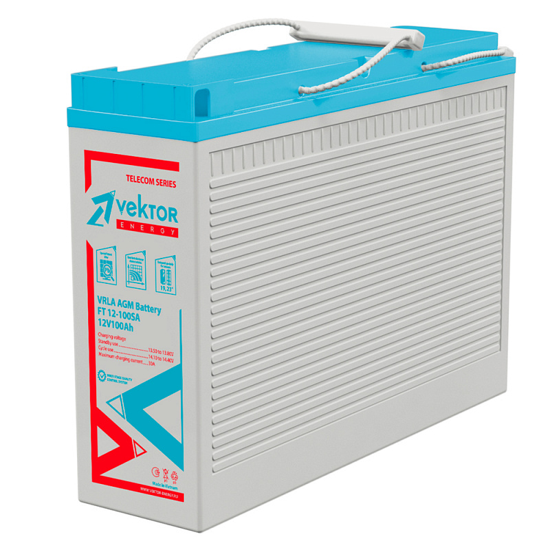 Фронтально-терминальный аккумулятор Vektor FT 12-100SA (12 В, 100 Ач) выпускается по технологии AGM и подходит для установки в 19 и 23 дюймовую серверную стойку или шкаф. Он подходит для источников бесперебойного питания средней мощности, железнодорожного транспорта, телекоммуникационного оборудования, центров обработки данных и других ответственных узлов. Благодаря специальному Pb-Ca-Sn-Al сплаву Vektor FT 12-100SA обладает повышенной плотностью энергии, устойчивости к коррозии, низким саморазрядом и длительным сроком службы — 15 лет. Vektor FT 12-100SA подходит для эксплуатации в экстремальных температурных условиях: от -20°C до +60°C.