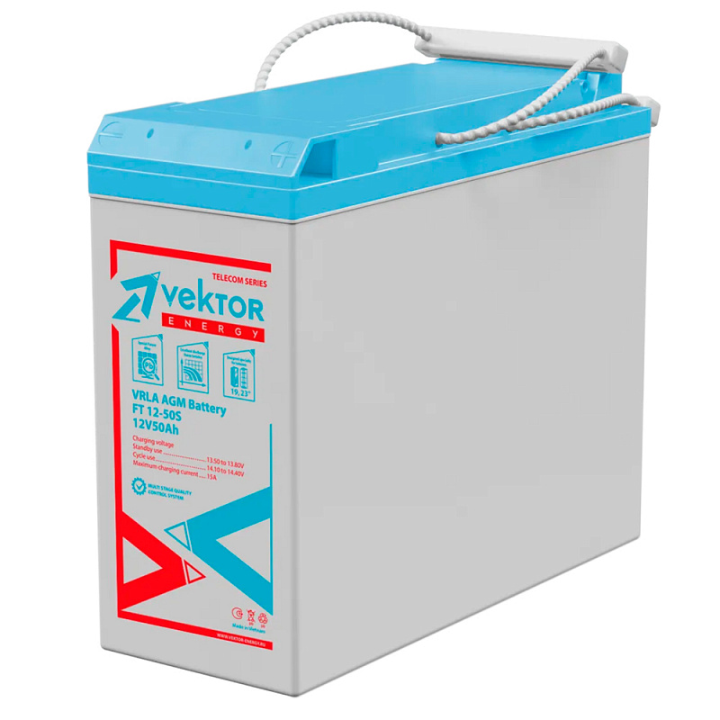 Фронтально-терминальный аккумулятор Vektor FT 12-50S (12 В, 50 Ач) выпускается по технологии AGM и подходит для установки в 19 и 23 дюймовую серверную стойку или шкаф. Он подходит для источников бесперебойного питания средней мощности, железнодорожного транспорта, телекоммуникационного оборудования, центров обработки данных и других ответственных узлов. Благодаря специальному Pb-Ca-Sn-Al сплаву Vektor FT 12-50S обладает повышенной плотностью энергии, устойчивости к коррозии, низким саморазрядом и длительным сроком службы — 15 лет. Vektor FT 12-50S подходит для эксплуатации в экстремальных температурных условиях: от -20°C до +60°C.