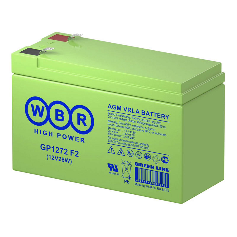 Аккумуляторная батарея WBR GP 1272 28W имеет усовершенствованную конструкцию легированных кальцием электродов из особо чистого свинца, что обеспечивает продолжительный срок службы и улучшенные разрядные характеристики. Аккумулятор отвечает всем современным требованиям к герметизированным батареям, имеет: сертификат соответствия Госстандарта РФ ("Ростест"), заключение ВНИИПО МВД "О пожаровзрывобезопасности".