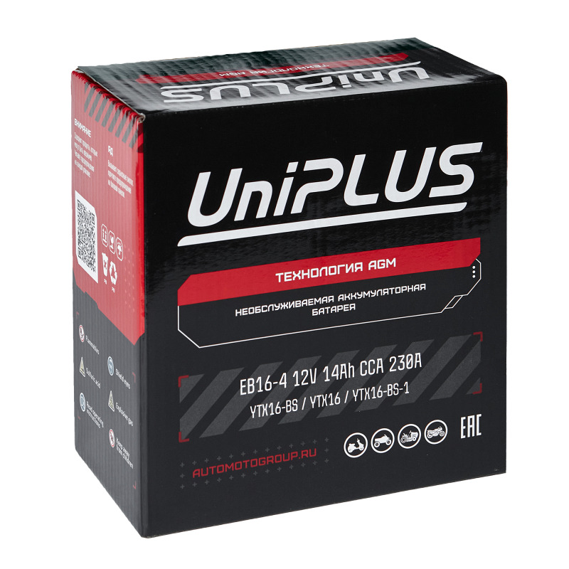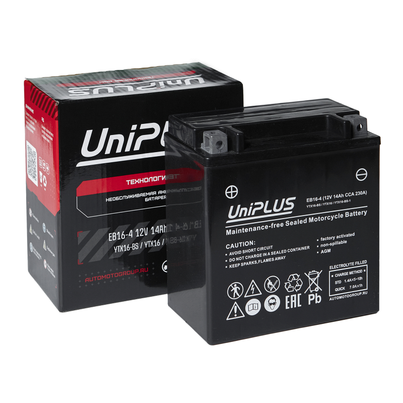 Аккумулятор Uplus EB16-4 (ёмкость 14 Ач, напряжение 12 В) разработан специально для мототехники по технологии AGM. Батареи этой серии выделяются целым рядом особенностей: высокие пусковые и стартерные токи, быстрый приём заряда и продолжительный срок службы. Пусковой ток составляет (CCA) 230 А, полярность клемм у батареи прямая (+-). Корпус из прочного полимера надёжно запаян, что защищает АКБ от протеканий и обеспечивает повышенную виброустойчивость. Благодаря сульфатоустойчивым пластинам Uplus EB16-4 обладает продолжительным сроком службы, он достигает 5 лет при правильной эксплуатации. Обслуживание не требуется. Мото аккумулятор активирован на заводе и полностью готов к эксплуатации. АКБ Uplus EB16-4 можно использовать в широком температурном спектре: от -40 до +40 °C. Это позволяет применять батарею не только для мотоциклов, квадроциклов, садовой и спецтехники, но и в зимний период для снегоходов. Свинцово-кислотный мотоаккумулятор Uplus EB16-4 является полным аналогом следующих моделей: YTX16-BS и YB16B-A.