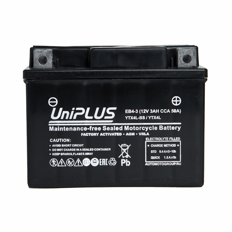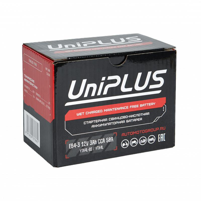 Аккумулятор Uplus EB 4-3 (ёмкость 3 Ач, напряжение 12 В) разработан специально для мототехники по технологии AGM. Батареи этой серии выделяются целым рядом особенностей: высокие пусковые и стартерные токи, быстрый приём заряда и продолжительный срок службы. Пусковой ток составляет (CCA) 50 А, полярность клемм у батареи обратная (-+). Корпус из прочного полимера надёжно запаян, что защищает АКБ от протеканий и обеспечивает повышенную виброустойчивость. Благодаря сульфатоустойчивым пластинам Uplus EB 4-3 обладает продолжительным сроком службы, он достигает 5 лет при правильной эксплуатации. Обслуживание не требуется. Мото аккумулятор активирован на заводе и полностью готов к эксплуатации. АКБ Uplus EB 4-3 можно использовать в широком температурном спектре: от -40 до +40 °C. Это позволяет применять батарею не только для мотоциклов, квадроциклов, садовой и спецтехники, но и в зимний период для снегоходов. Свинцово-кислотный мотоаккумулятор Uplus EB 4-3 является полным аналогом следующих моделей: YB4L-B, YTX4L-BS и YB4L-A.