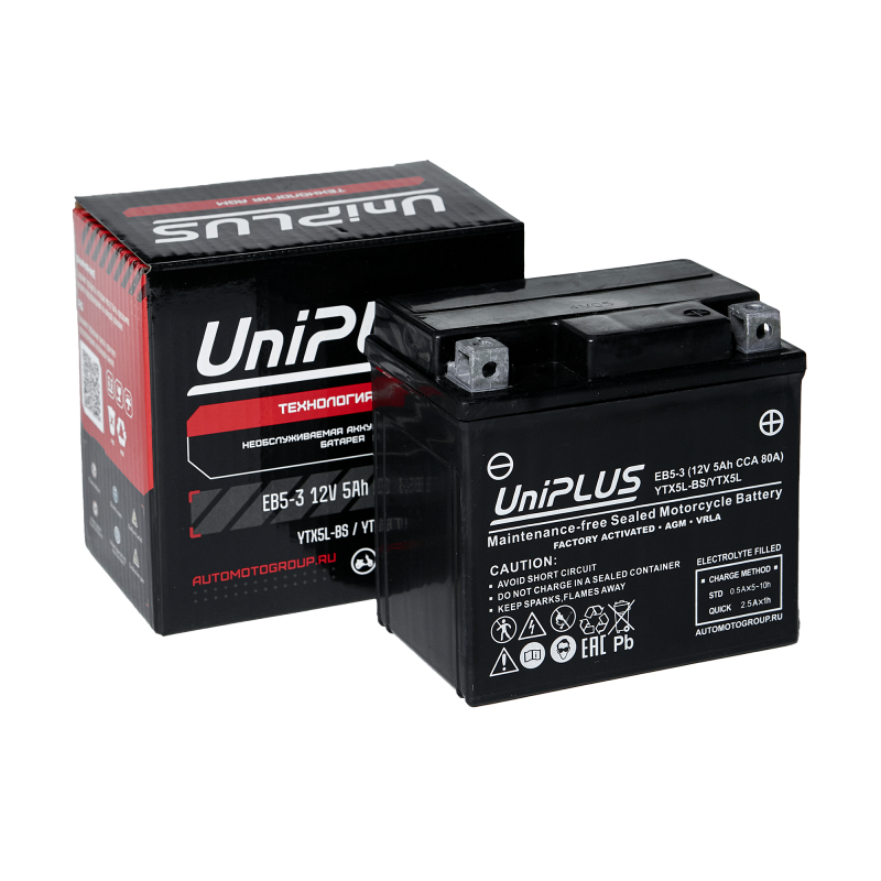 Аккумулятор Uplus EB 5-3 (ёмкость 4 Ач, напряжение 12 В) разработан специально для мототехники по технологии AGM. Батареи этой серии выделяются целым рядом особенностей: высокие пусковые и стартерные токи, быстрый приём заряда и продолжительный срок службы. Пусковой ток составляет (CCA) 70 А, полярность клемм у батареи обратная (-+). Корпус из прочного полимера надёжно запаян, что защищает АКБ от протеканий и обеспечивает повышенную виброустойчивость. Благодаря сульфатоустойчивым пластинам Uplus EB 5-3 обладает продолжительным сроком службы, он достигает 5 лет при правильной эксплуатации. Обслуживание не требуется. Мото аккумулятор активирован на заводе и полностью готов к эксплуатации. АКБ Uplus EB 5-3 можно использовать в широком температурном спектре: от -40 до +40 °C. Это позволяет применять батарею не только для мотоциклов, квадроциклов, садовой и спецтехники, но и в зимний период для снегоходов. Свинцово-кислотный мотоаккумулятор Uplus EB 5-3 является полным аналогом следующих моделей: YTX5-L-BS.