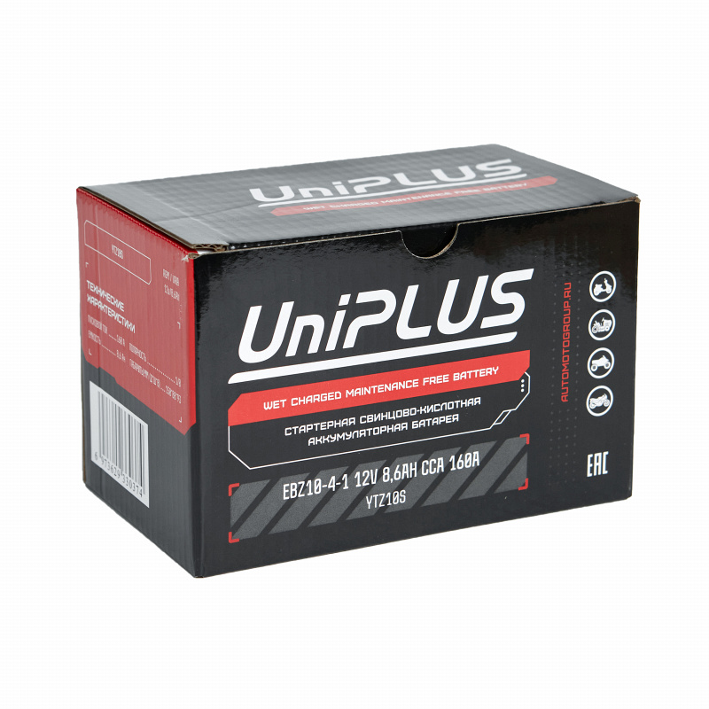 Аккумулятор Uplus EBZ10-4 (ёмкость 8.6 Ач, напряжение 12 В) разработан специально для мототехники по технологии AGM. Батареи этой серии выделяются целым рядом особенностей: высокие пусковые и стартерные токи, быстрый приём заряда и продолжительный срок службы. Пусковой ток составляет (CCA) 190 А, полярность клемм у батареи прямая (+-). Корпус из прочного полимера надёжно запаян, что защищает АКБ от протеканий и обеспечивает повышенную виброустойчивость. Благодаря сульфатоустойчивым пластинам Uplus EBZ10-4 обладает продолжительным сроком службы, он достигает 5 лет при правильной эксплуатации. Обслуживание не требуется. Мото аккумулятор активирован на заводе и полностью готов к эксплуатации. АКБ Uplus EBZ10-4 можно использовать в широком температурном спектре: от -40 до +40 °C. Это позволяет применять батарею не только для мотоциклов, квадроциклов, садовой и спецтехники, но и в зимний период для снегоходов. Свинцово-кислотный мотоаккумулятор Uplus EBZ10-4 является полным аналогом следующих моделей: YTZ10S.