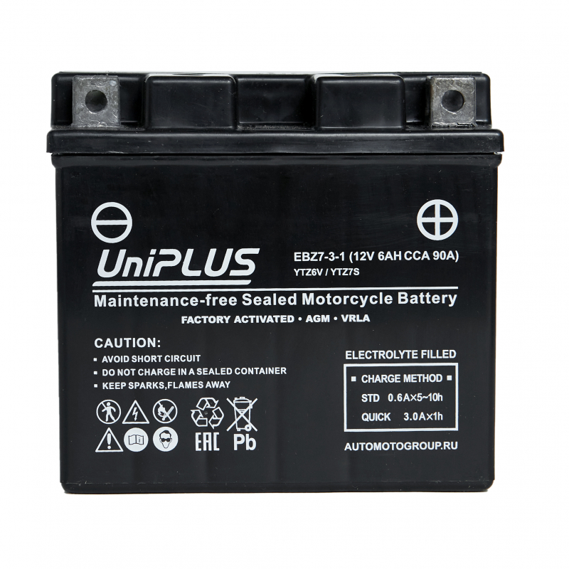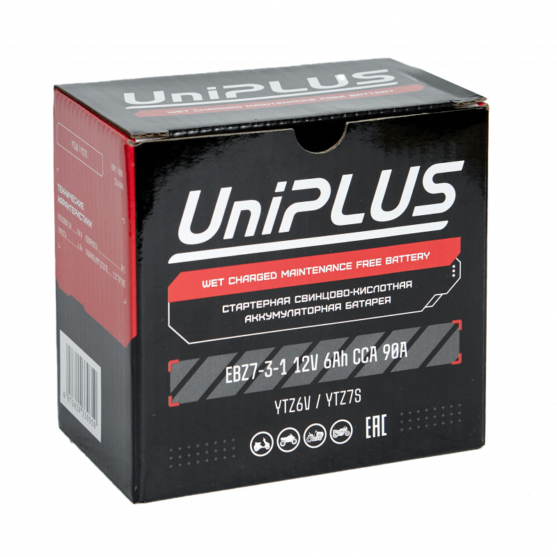 Аккумулятор Uplus EBZ7-3 (ёмкость 6 Ач, напряжение 12 В) разработан специально для мототехники по технологии AGM. Батареи этой серии выделяются целым рядом особенностей: высокие пусковые и стартерные токи, быстрый приём заряда и продолжительный срок службы. Пусковой ток составляет (CCA) 130 А, полярность клемм у батареи обратная (-+). Корпус из прочного полимера надёжно запаян, что защищает АКБ от протеканий и обеспечивает повышенную виброустойчивость. Благодаря сульфатоустойчивым пластинам Uplus EBZ7-3 обладает продолжительным сроком службы, он достигает 5 лет при правильной эксплуатации. Обслуживание не требуется. Мото аккумулятор активирован на заводе и полностью готов к эксплуатации. АКБ Uplus EBZ7-3 можно использовать в широком температурном спектре: от -40 до +40 °C. Это позволяет применять батарею не только для мотоциклов, квадроциклов, садовой и спецтехники, но и в зимний период для снегоходов. Свинцово-кислотный мотоаккумулятор Uplus EBZ7-3 является полным аналогом следующих моделей: YTZ7S и YTX5L.