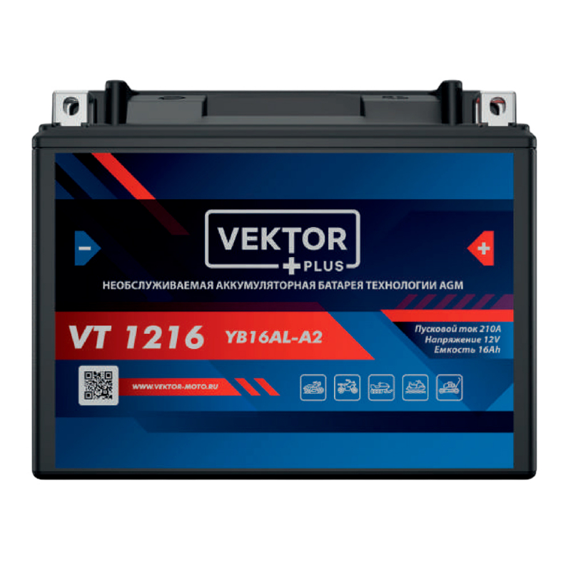 Свинцово-кислотный аккумулятор Vektor VT 1216 (12 В; 16 Ач) разработан специально для мототехнки. Батарея подходит для эксплуатации в суровых климатических условиях, она устойчива к воздействию вибрации и работает при температуре от -30 до +60 °C. Высокий пусковой ток гарантирует запуск двигателя даже при экстремальных температурах и повышенных нагрузках. Технология AGM обеспечивает надёжность Vektor VT 1216 и продолжительный срок службы — до 5 лет. Аккумулятор сразу готов к эксплуатации и не требует долива дистиллята, корпус надёжно герметизирован. Vektor VT 1216 подходит для городских скутеров, турэндуро, квадроциклов, мотоциклов, мопедов и прочей мототехники.