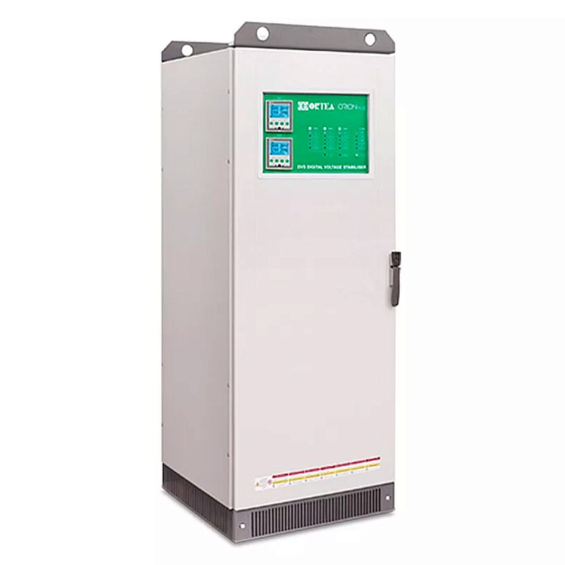 Ortea Orion Plus 60-15/45 это трёхфазный промышленный стабилизатор напряжения итальянского производства мощностью 60 кВА, выпускаемый в напольном форм-факторе. Он адаптирован под работу с особенностями промышленных электросетей и может регулировать напряжение независимо по каждой фазе, что позволяет питать как трёхфазное, так и однофазное оборудование. Ortea Orion Plus 60-15/45 регулирует входное и выходное напряжение с высочайшей точностью (0.5%), делая это бесступенчато под двойным микропроцессорным управлением. Трёхфазный стабилизатор напряжения производится в модульных шкафах, устойчивых к влиянию окружающей среды (IP21) и механических воздействий, его можно эксплуатировать в широком температурном диапазоне: от -25°C до +45°C. На передней панели Ortea Orion Plus 60-15/45 расположен контрольно-информационный блок, он представляет собой два многофункциональных мультиметра и светодиодные индикаторы с аварийными сигналами.