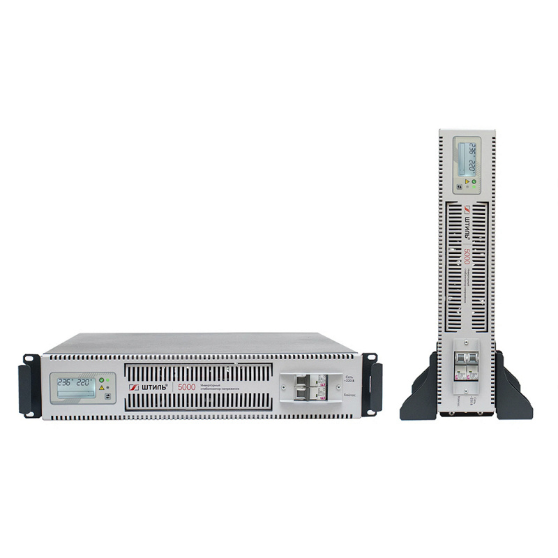 Однофазный (1-1) инверторный стабилизатор напряжения Штиль IS5000RT производится в России мощностью 5 кВА / 4.5 кВт в универсальном форм-факторе. Он подходит для обеспечения стабильного электропитания такого оборудования, как: видео и аудиоаппаратура, торговые и кассовые аппараты, компьютеры и офисная техника, серверные, системы безопасности, аппараты связи, центры обработки данных. Штиль IS5000RT разработан с учётом специфики российских электрических сетей и полностью соответствует требованиям Таможенного союза (ЕАС). Топология двойного преобразования (Online) обеспечивает целый ряд преимуществ: мгновенная реакция на изменение параметров сети (0 мс), высокая точность коррекции напряжения и выдаёт на выходе идеальную синусоиду. При кратковременном отключении сети нагрузка обеспечивается ещё 200 мс.
