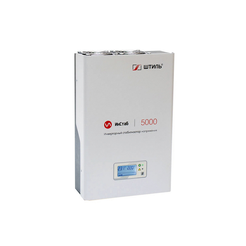 Однофазный (1-1) настенный инверторный стабилизатор напряжения Штиль IS5000 производится в России мощностью 5 кВА / 4.5 кВт. Он подходит для обеспечения стабильного электропитания такого оборудования, как: системы ГВС и водоснабжения, компьютерной техники, телевизоров и аудио-видео аппаратуры, холодильников, электроинструментов и охранных систем. Штиль IS5000 разработан с учётом специфики российских электрических сетей и полностью соответствует требованиям Таможенного союза (ЕАС). Топология двойного преобразования (Online) обеспечивает целый ряд преимуществ: мгновенная реакция на изменение параметров сети (0 мс), высокая точность коррекции напряжения и выдаёт на выходе идеальную синусоиду. При кратковременном отключении сети нагрузка обеспечивается ещё 200 мс.