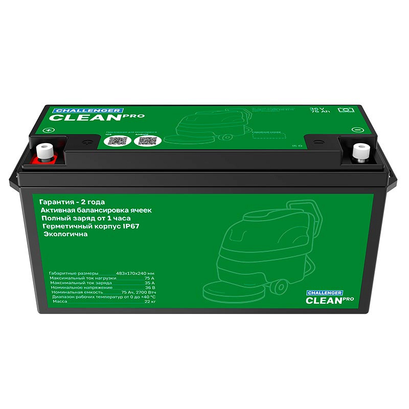Литий-ионный (LiFePO4) тягоый аккумулятор Challenger Clean PRO 36-75 производится напряжением 36 и ёмкостью 75 Ач. Главная особенность батареи — продолжительный срок службы, в циклическом режиме он превышает 2000 циклов заряда-разряда при DOD = 80%. Так же акб поддходит для работы при температуре от -20 до +60 ℃. Герметичный корпус выполнен из прочного ABS пластика и обеспечивает уровень пылевлагозащиты IP65. Challenger Clean PRO 36-75 это универсальный тяговый аккумулятор, который подойдёт для водного транспорта, электромобилей, альтернативной энергетики, источников бесперебойного питания, систем безопасности и сигнализации, систем связи, медицинских учреждений, а также для поломоечной техники. Батарея защищена от перезаряда, глубоких разрядов, коротких замыканий, высоких и низких температур.