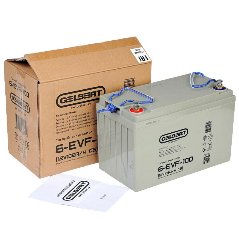 Свинцово-кислотный тяговый аккумулятор Gelbert 6-EVF-100 (ёмкость 115 Ач, напряжение 12 В) производится по технологии GEL и рекомендован для техники на электрической тяге. Электролит загущен до желеобразного состояния, благодаря чему батарея более устойчива к температурному воздействию и глубоким разрядам. Гелевые аккумуляторы отличаются повышенным числом циклов заряд-разряд: более 700 при DOD (глубине разряда) 80%. Пластины тягового аккумулятора снабжены более плотным активным материалом, благодаря этому они устойчивы к глубоким разрядам и не теряют ёмкость. Тяговый аккумулятор Gelbert 6-EVF-100 применяется в различной технике с электродвигателями. Корпус выполнен из ударопрочного ABS пластика и надёжно герметизирован. На крышке аккумулятора Gelbert 6-EVF-100 предусмотрен односторонний клапан избыточного давления. Дата производства аккумулятора Gelbert 6-EVF-100 указана на крышке в виде символьного кода.