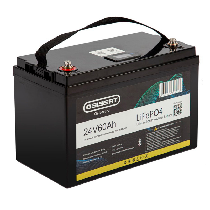 Тяговый литий-железо-фосфатный (LiFePO4) аккумулятор Gelbert LiFePO4 24В 60Ач производится напряжением 24 В и ёмкостью 60 Ач. Внутри корпуса установлена BMS (Battery Management System) плата, она контролирует процесс заряда и разряда акб, отслеживает её состояние и температуру. Срок службы тягового литиевого аккумулятора Gelbert LiFePO4 24В 60Ач составляет 12 лет в буферном режиме и более 4000 циклов при DoD не более 80% в циклическом режиме работы. Помимо малой массы и длительного срока эксплуатации Gelbert LiFePO4 24В 60Ач отличается от свинцово-кислотных работой при экстремальных условиях: батарею можно использовать при температуре до 55 °С.
