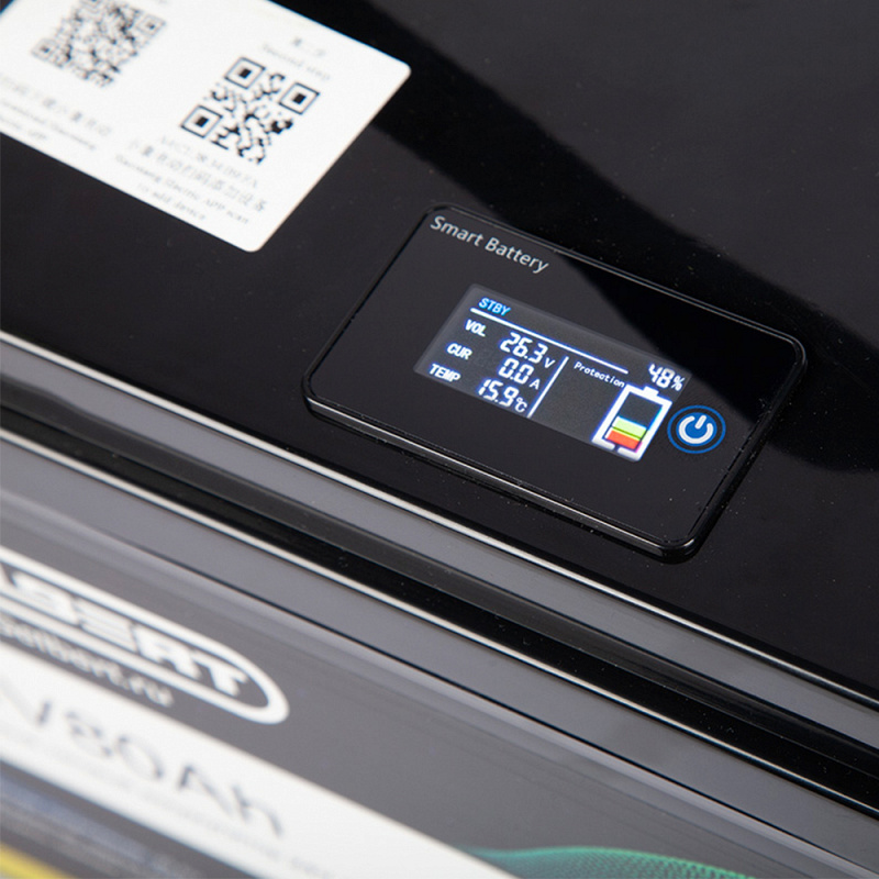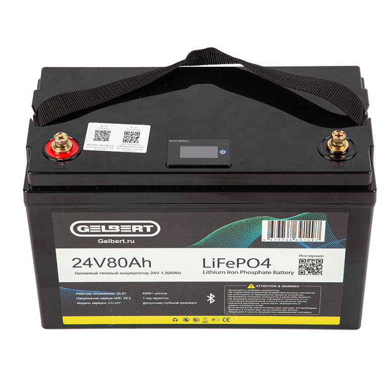Тяговый литий-железо-фосфатный (LiFePO4) аккумулятор Gelbert LiFePO4 24В 80Ач производится напряжением 24 В и ёмкостью 80 Ач. Внутри корпуса установлена BMS (Battery Management System) плата, она контролирует процесс заряда и разряда акб, отслеживает её состояние и температуру. Срок службы тягового литиевого аккумулятора Gelbert LiFePO4 24В 80Ач составляет 12 лет в буферном режиме и более 4000 циклов при DoD не более 80% в циклическом режиме работы. Помимо малой массы и длительного срока эксплуатации Gelbert LiFePO4 24В 80Ач отличается от свинцово-кислотных работой при экстремальных условиях: батарею можно использовать при температуре до 55 °С.