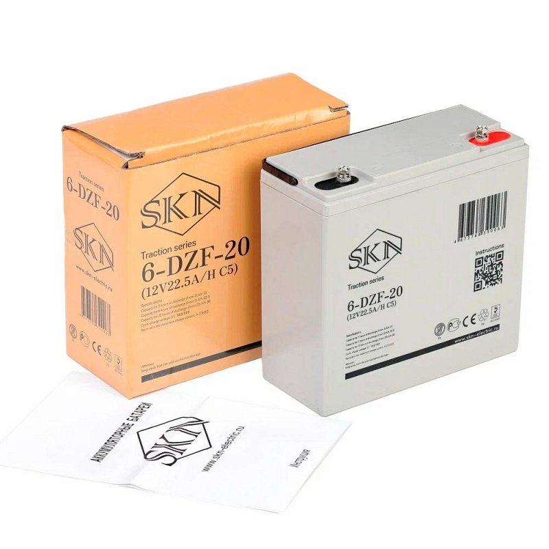 Свинцово-кислотный тяговый аккумулятор SKN 6-DZF-20 (ёмкость 28 Ач, напряжение 12 В) производится по технологии GEL и рекомендован для техники на электрической тяге. Электролит загущен до желеобразного состояния, благодаря чему батарея более устойчива к температурному воздействию и глубоким разрядам. Гелевые аккумуляторы отличаются повышенным числом циклов заряд-разряд: более 700 при DOD (глубине разряда) 80%. Пластины тягового аккумулятора снабжены более плотным активным материалом, благодаря этому они устойчивы к глубоким разрядам и не теряют ёмкость. Тяговый аккумулятор SKN 6-DZF-20 применяется в различной технике с электродвигателями. Корпус выполнен из ударопрочного ABS пластика и надёжно герметизирован. На крышке аккумулятора SKN 6-DZF-20 предусмотрен односторонний клапан избыточного давления. Дата производства аккумулятора SKN 6-DZF-20 указана на крышке в виде символьного кода.