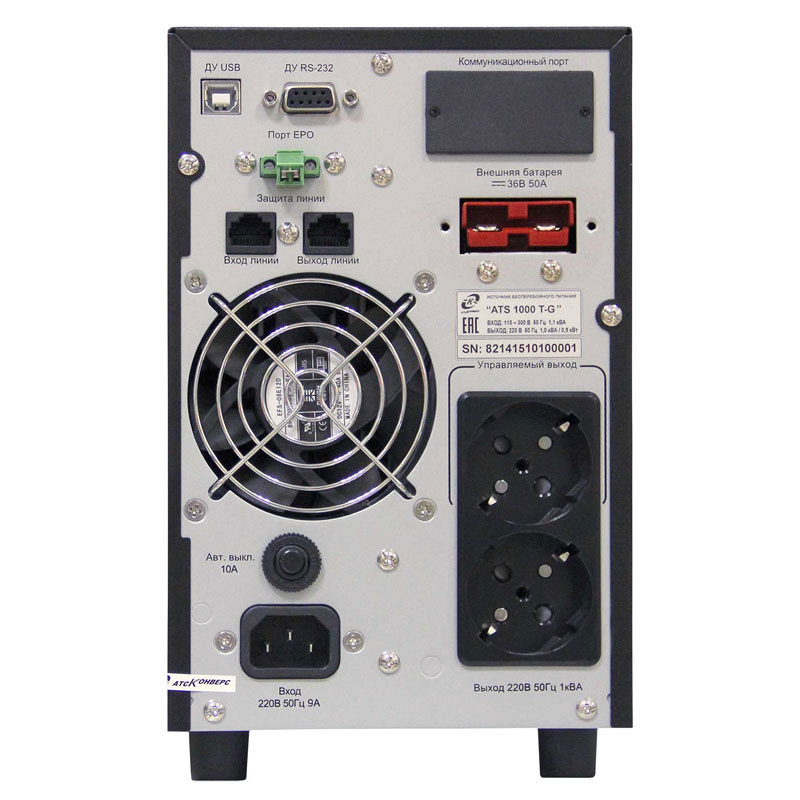 Отечественный однофазный источник бесперебойного питания с двойным преобразованием энергии (технология on-line) ATS 1000 T-G мощностью 1 кВА/0.9 кВт выпускается в башенном исполнении: его можно установить вертикально на пол. Источник поставляется без внутренних батарей. На передней панели предусмотрен дисплей с тремя кнопками управления. На выходе ИБП ATS 1000 T-G выдаёт чистую синусоиду, что позволяет питать от него даже самое чувствительное оборудование. Источник бесперебойного питания энергоэффективен даже при работе по обводной цепи - КПД составляет 97%.