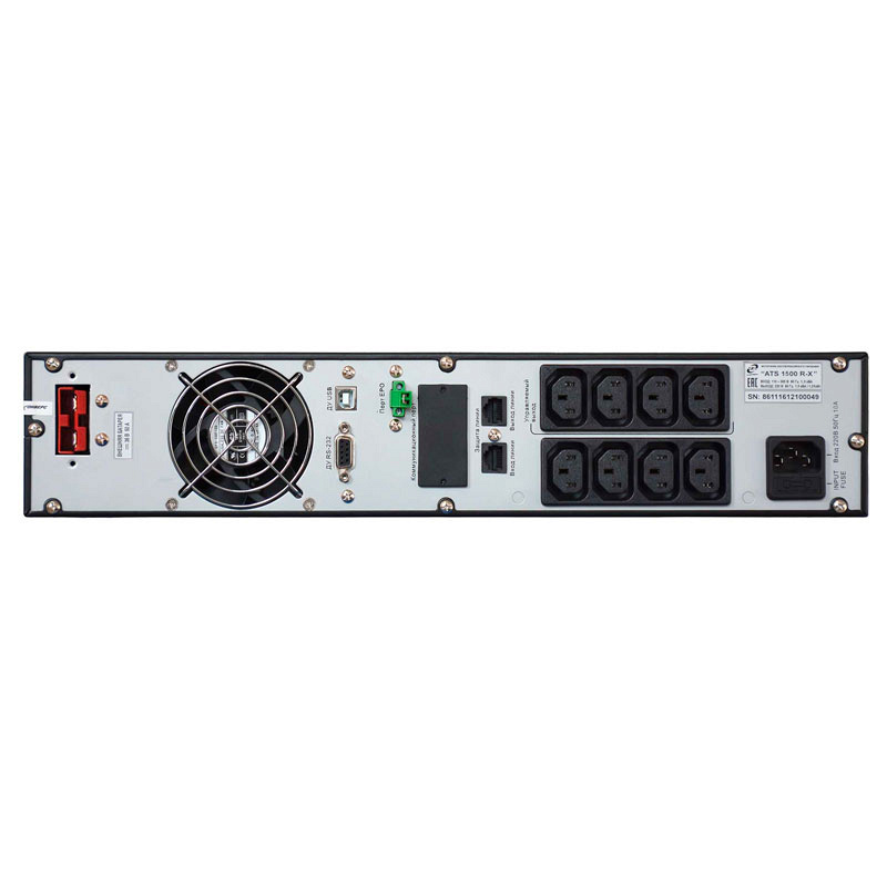Отечественный однофазный источник бесперебойного питания с двойным преобразованием энергии (технология on-line) ATS 1500 R-X мощностью 1.5 кВА/1.35 кВт выпускается в универсальном исполнении: его можно установить в стандартную 19 дюймовую стойку (требуется дополнительный крепеж) или поставить вертикально на пол. Источник поставляется без аккумуляторных батарей. На передней панели предусмотрен дисплей с тремя кнопками управления. На выходе ИБП ATS 1500 R-X выдаёт чистую синусоиду, что позволяет питать от него даже самое чувствительное оборудование. Источник бесперебойного питания энергоэффективен даже при работе по обводной цепи - КПД составляет 97%.