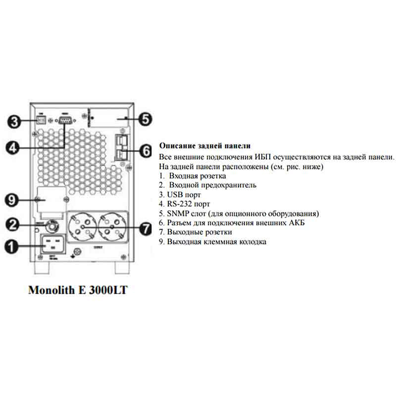 Однофазный онлайн ИБП Eltena Monolith E3000LT работает от внешних свинцово-кислотных АКБ. Выводы расположены на задней панели и выполнены в виде стандартных евро-розеток. Также сзади располагаются слоты для дополнительных интерфейсов, сетевые карты и другие опции приобретаются отдельно. Они позволяют расширить функционал Eltena Monolith E3000LT. Например, SNMP карта предоставляет возможность дистанционного управление источником бесперебойного питания, используя компьютер с выходом в интернет и стандартный браузер. Кулеры системы охлаждения работают тихо, шум на расстоянии 1 метра от источника бесперебойного питания не превышает 50 дБ.