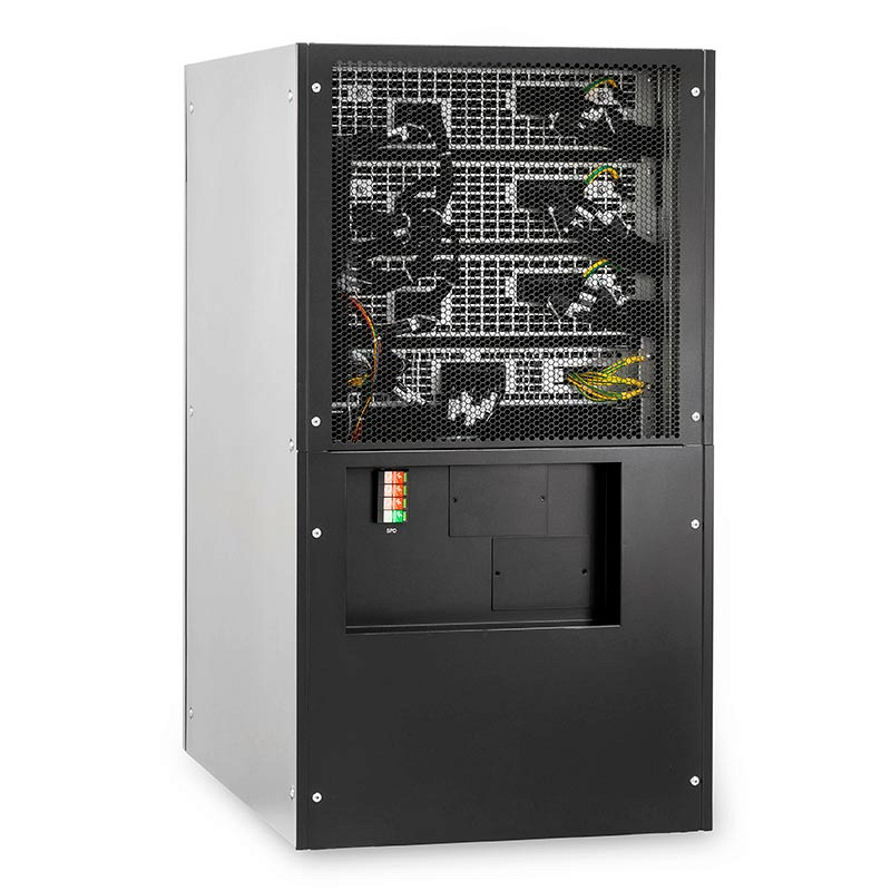 Российский однофазный Онлайн ИБП ЕРМАК 380-380.120-М30Р мощностью 30 кВА \ 27 кВт — это высокая мощность в компактном корпусе. Напольный форм-фактор (Tower) позволяет монтировать источник бесперебойного питания вертикально, он не занимает много места. Топология двойного преобразования (Online) обеспечивает наилучшую защиту подключаемого оборудования от любых неполадок электросети. Однофазный ИБП ЕРМАК 380-380.120-М30Р совместим с дизельными генераторам, поддерживает «горячую» замену аккумуляторов и функцию «холодный» старт. Источник бесперебойного питания работает от внутренних батарей: 30-50 шт. Встроенное ЗУ мощностью 60 А отслеживает состояние АКБ и сигнализирует, когда требуется замена. На задней панели расположена клеммная колодка и коммуникационные порты: RS232, USB, EPO, SNMP, «сухие» контакты. ИБП ЕРМАК 380-380.120-М30Р производит самодиагностику во время запуска и автоматически регулирует скорость работы вентилятора охлаждения.