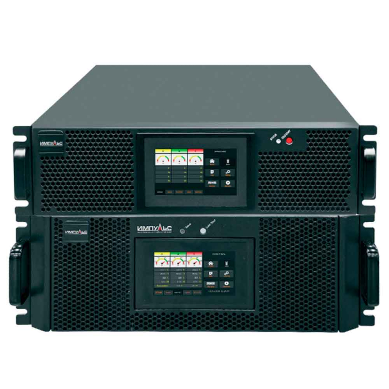 Внутри трёхфазного online ИБП ИМПУЛЬС ФОРВАРД 3330 установлен сигнальный процессор DSP, он обеспечивает полный контроль над бесперебойником и его состоянием. На передней панели установлен сенсорный дисплей 5.5 дюймов, с его помощью удобно выбирать режимы работы и отслеживать состояние оборудования. На задней панели установлена система активного охлаждения, её уровень шума на расстоянии в 1 м не превышает 65 дБ при 100% нагрузке. Также сзади расположены порты для подключения дополнительных возможностей: USB, SNMP, RS232, RS485, программируемый порт, сухие контакты, слоты для параллельного подключения ИБП. К ИМПУЛЬС ФОРВАРД 3330 подключается 40 свинцово-кислотных батарей, они монтируются отдельно от ИБП в стойку и поддерживают функцию «холодного» старта: включить ИБП без напряжения сети. Встроенная система интеллектуального управления батареями отслеживает состояние АКБ, контролирует процесс заряда и отслеживает состояние аккумуляторов. Это существенно увеличивает их срок службы и удешевляет обслуживание ИБП. Для увеличения времени автономной работы к ФОРВАРД 3330 можно подключить внешние батарейные модули.