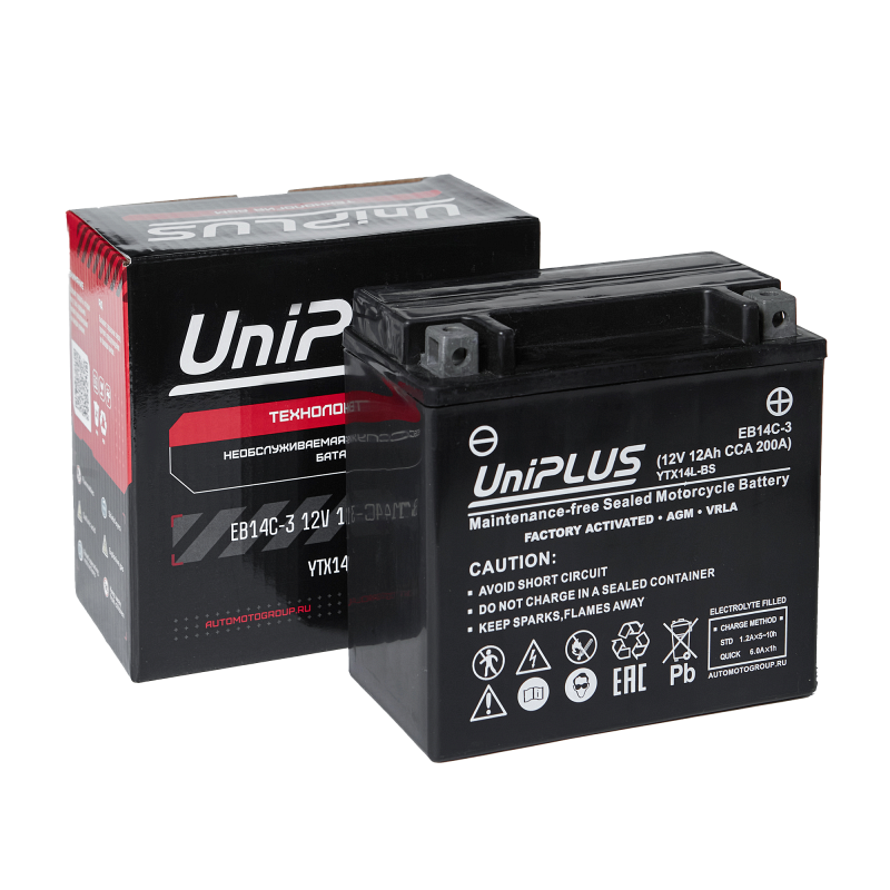 Аккумулятор Uplus EB14C-3 (ёмкость 12 Ач, напряжение 12 В) разработан специально для мототехники по технологии AGM. Батареи этой серии выделяются целым рядом особенностей: высокие пусковые и стартерные токи, быстрый приём заряда и продолжительный срок службы. Пусковой ток составляет (CCA) 200 А, полярность клемм у батареи обратная (-+). Корпус из прочного полимера надёжно запаян, что защищает АКБ от протеканий и обеспечивает повышенную виброустойчивость. Благодаря сульфатоустойчивым пластинам Uplus EB14C-3 обладает продолжительным сроком службы, он достигает 5 лет при правильной эксплуатации. Обслуживание не требуется. Мото аккумулятор активирован на заводе и полностью готов к эксплуатации. АКБ Uplus EB14C-3 можно использовать в широком температурном спектре: от -40 до +40 °C. Это позволяет применять батарею не только для мотоциклов, квадроциклов, садовой и спецтехники, но и в зимний период для снегоходов. Свинцово-кислотный мотоаккумулятор Uplus EB14C-3 является полным аналогом следующих моделей: YTX14L-BS.