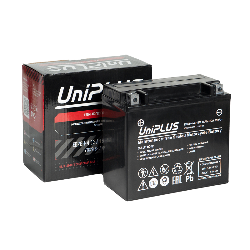 Аккумулятор Uplus EB20H-4 (ёмкость 18 Ач, напряжение 12 В) разработан специально для мототехники по технологии AGM. Батареи этой серии выделяются целым рядом особенностей: высокие пусковые и стартерные токи, быстрый приём заряда и продолжительный срок службы. Пусковой ток составляет (CCA) 310 А, полярность клемм у батареи прямая (+-). Корпус из прочного полимера надёжно запаян, что защищает АКБ от протеканий и обеспечивает повышенную виброустойчивость. Благодаря сульфатоустойчивым пластинам Uplus EB20H-4 обладает продолжительным сроком службы, он достигает 5 лет при правильной эксплуатации. Обслуживание не требуется. Мото аккумулятор активирован на заводе и полностью готов к эксплуатации. АКБ Uplus EB20H-4 можно использовать в широком температурном спектре: от -40 до +40 °C. Это позволяет применять батарею не только для мотоциклов, квадроциклов, садовой и спецтехники, но и в зимний период для снегоходов. Свинцово-кислотный мотоаккумулятор Uplus EB20H-4 является полным аналогом следующих моделей: YTX20, YTX20H YB16-B-CX, YB16-B и YB18-A.