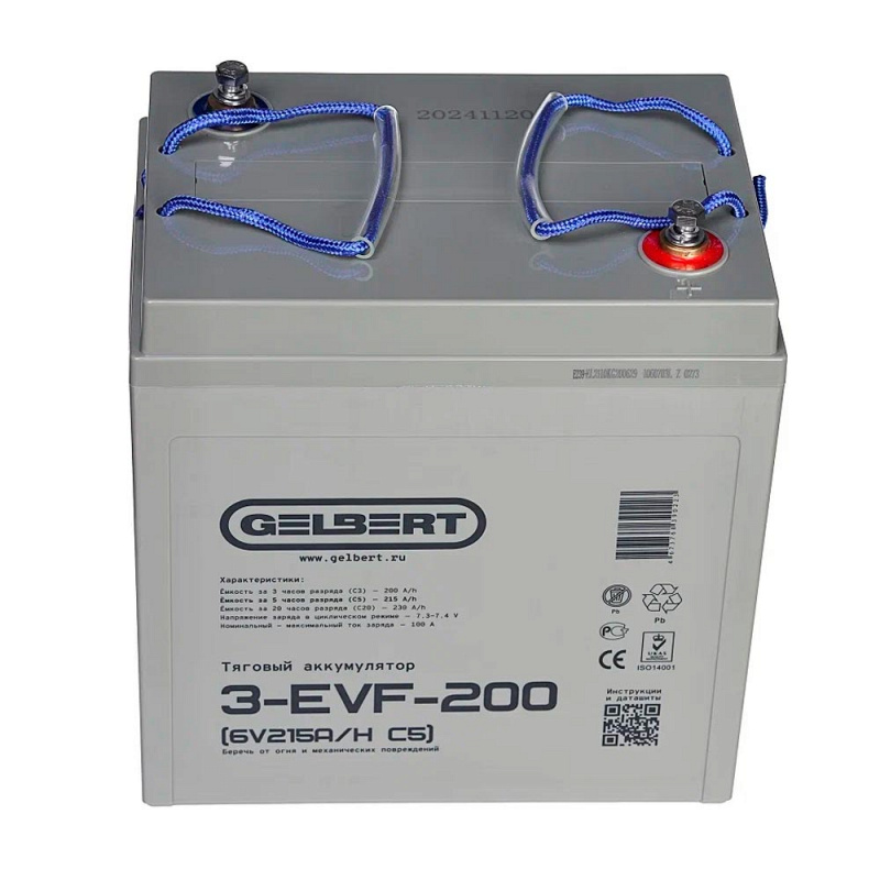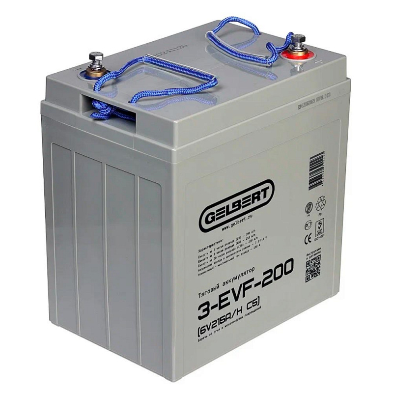 Свинцово-кислотный тяговый аккумулятор Gelbert 3-EVF-200 (ёмкость 220 Ач, напряжение 12 В) производится по технологии GEL и рекомендован для техники на электрической тяге. Электролит загущен до желеобразного состояния, благодаря чему батарея более устойчива к температурному воздействию и глубоким разрядам. Гелевые аккумуляторы отличаются повышенным числом циклов заряд-разряд: более 700 при DOD (глубине разряда) 80%. Пластины тягового аккумулятора снабжены более плотным активным материалом, благодаря этому они устойчивы к глубоким разрядам и не теряют ёмкость. Тяговый аккумулятор Gelbert 3-EVF-200 применяется в различной технике с электродвигателями. Корпус выполнен из ударопрочного ABS пластика и надёжно герметизирован. На крышке аккумулятора Gelbert 3-EVF-200 предусмотрен односторонний клапан избыточного давления. Дата производства аккумулятора Gelbert 3-EVF-200 указана на крышке в виде символьного кода.