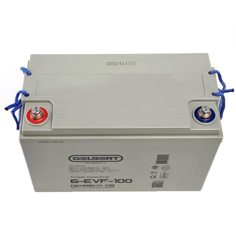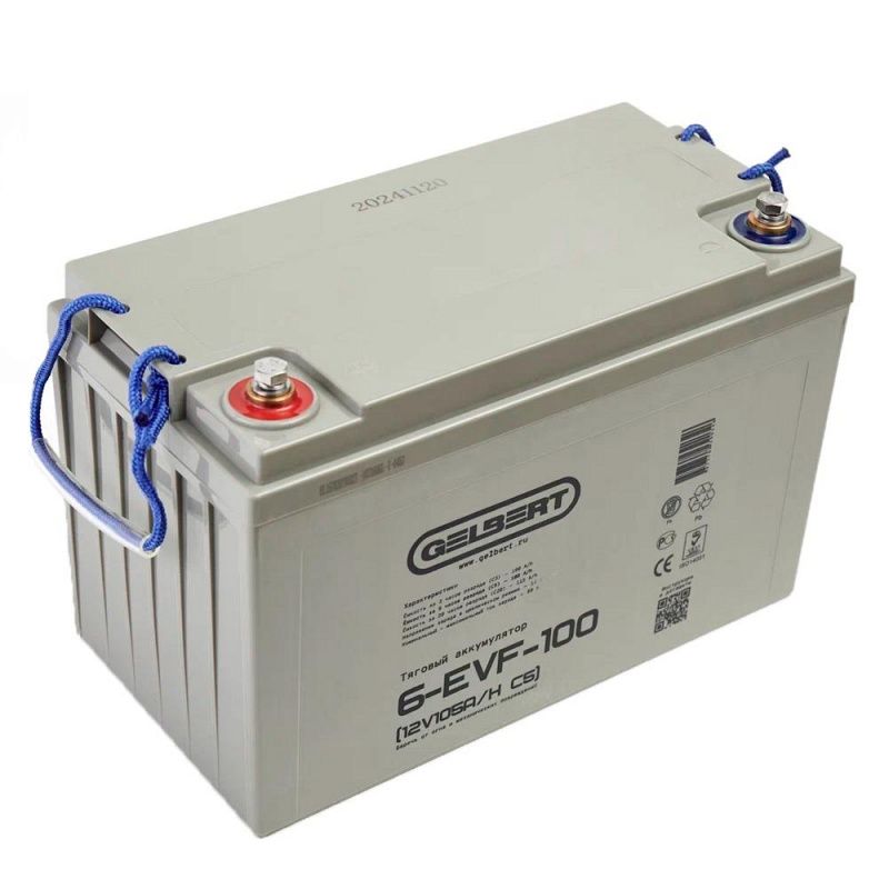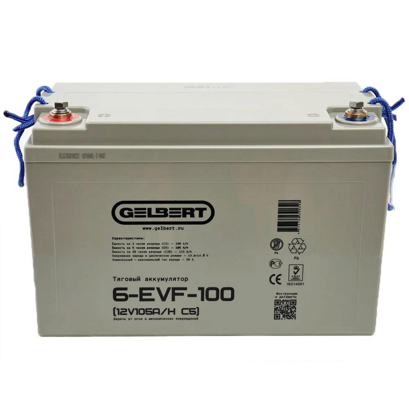 Свинцово-кислотный тяговый аккумулятор Gelbert 6-EVF-100 (ёмкость 115 Ач, напряжение 12 В) производится по технологии GEL и рекомендован для техники на электрической тяге. Электролит загущен до желеобразного состояния, благодаря чему батарея более устойчива к температурному воздействию и глубоким разрядам. Гелевые аккумуляторы отличаются повышенным числом циклов заряд-разряд: более 700 при DOD (глубине разряда) 80%. Пластины тягового аккумулятора снабжены более плотным активным материалом, благодаря этому они устойчивы к глубоким разрядам и не теряют ёмкость. Тяговый аккумулятор Gelbert 6-EVF-100 применяется в различной технике с электродвигателями. Корпус выполнен из ударопрочного ABS пластика и надёжно герметизирован. На крышке аккумулятора Gelbert 6-EVF-100 предусмотрен односторонний клапан избыточного давления. Дата производства аккумулятора Gelbert 6-EVF-100 указана на крышке в виде символьного кода.