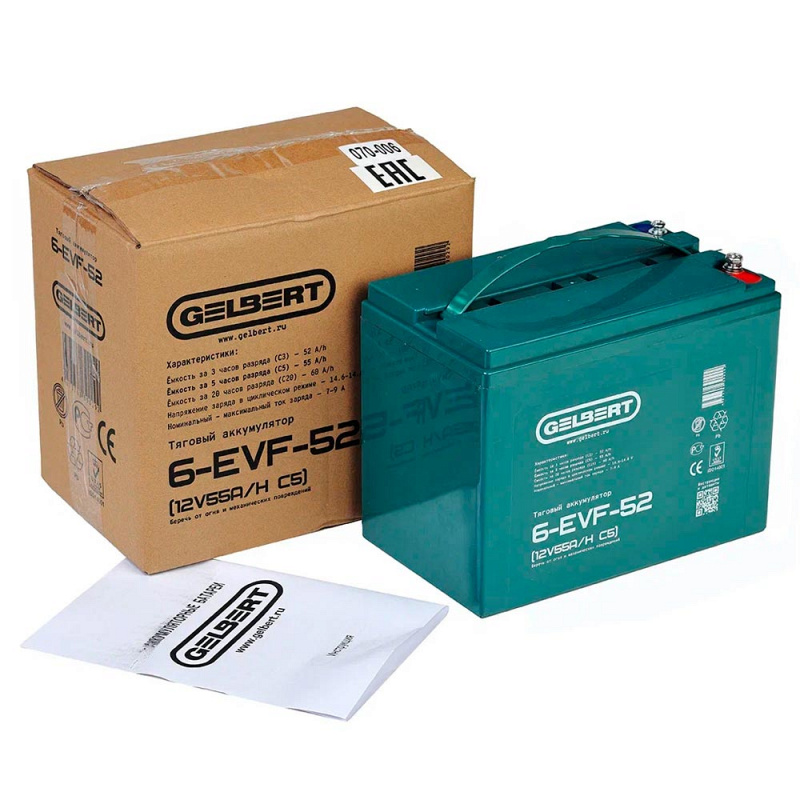 Свинцово-кислотный тяговый аккумулятор Gelbert 6-EVF-52 (ёмкость 60 Ач, напряжение 12 В) производится по технологии GEL и рекомендован для техники на электрической тяге. Электролит загущен до желеобразного состояния, благодаря чему батарея более устойчива к температурному воздействию и глубоким разрядам. Гелевые аккумуляторы отличаются повышенным числом циклов заряд-разряд: более 700 при DOD (глубине разряда) 80%. Пластины тягового аккумулятора снабжены более плотным активным материалом, благодаря этому они устойчивы к глубоким разрядам и не теряют ёмкость. Тяговый аккумулятор Gelbert 6-EVF-52 применяется в различной технике с электродвигателями. Корпус выполнен из ударопрочного ABS пластика и надёжно герметизирован. На крышке аккумулятора Gelbert 6-EVF-52 предусмотрен односторонний клапан избыточного давления. Дата производства аккумулятора Gelbert 6-EVF-52 указана на крышке в виде символьного кода.