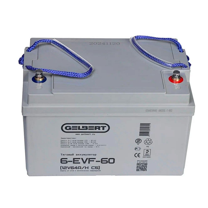 Свинцово-кислотный тяговый аккумулятор Gelbert 6-EVF-60 (ёмкость 70 Ач, напряжение 12 В) производится по технологии GEL и рекомендован для техники на электрической тяге. Электролит загущен до желеобразного состояния, благодаря чему батарея более устойчива к температурному воздействию и глубоким разрядам. Гелевые аккумуляторы отличаются повышенным числом циклов заряд-разряд: более 700 при DOD (глубине разряда) 80%. Пластины тягового аккумулятора снабжены более плотным активным материалом, благодаря этому они устойчивы к глубоким разрядам и не теряют ёмкость. Тяговый аккумулятор Gelbert 6-EVF-60 применяется в различной технике с электродвигателями. Корпус выполнен из ударопрочного ABS пластика и надёжно герметизирован. На крышке аккумулятора Gelbert 6-EVF-60 предусмотрен односторонний клапан избыточного давления. Дата производства аккумулятора Gelbert 6-EVF-60 указана на крышке в виде символьного кода.