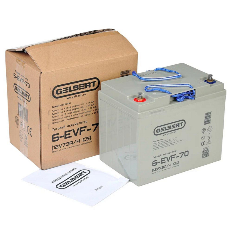 Свинцово-кислотный тяговый аккумулятор Gelbert 6-EVF-70 (ёмкость 78 Ач, напряжение 12 В) производится по технологии AGM и рекомендован для техники на электрической тяге. Электролитом пропитаны микропористые сепараторы из стекловолокна, благодаря чему батарея более устойчива к температурному воздействию и глубоким разрядам. Такие аккумуляторы отличаются повышенным числом циклов заряд-разряд: более 700 при DOD (глубине разряда) 80%. Пластины тягового аккумулятора снабжены более плотным активным материалом, благодаря этому они устойчивы к глубоким разрядам и не теряют ёмкость. Тяговый аккумулятор Gelbert 6-EVF-70 применяется в различной технике с электродвигателями. Корпус выполнен из ударопрочного ABS пластика и надёжно герметизирован. На крышке аккумулятора Gelbert 6-EVF-70 предусмотрен односторонний клапан избыточного давления. Дата производства аккумулятора Gelbert 6-EVF-70 указана на крышке в виде символьного кода.