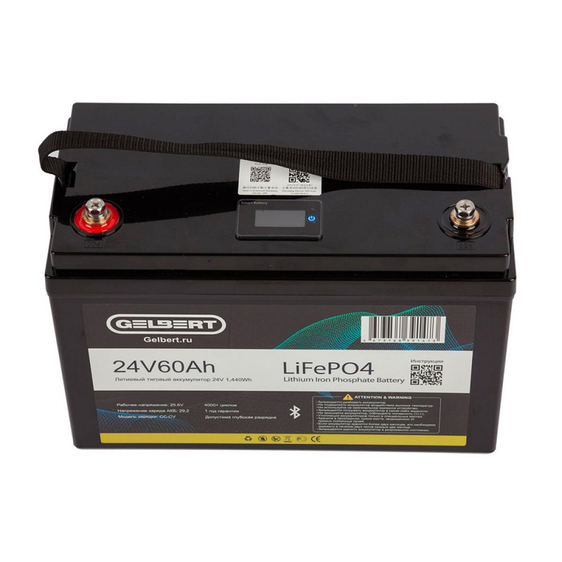 Тяговый литий-железо-фосфатный (LiFePO4) аккумулятор Gelbert LiFePO4 24В 60Ач производится напряжением 24 В и ёмкостью 60 Ач. Внутри корпуса установлена BMS (Battery Management System) плата, она контролирует процесс заряда и разряда акб, отслеживает её состояние и температуру. Срок службы тягового литиевого аккумулятора Gelbert LiFePO4 24В 60Ач составляет 12 лет в буферном режиме и более 4000 циклов при DoD не более 80% в циклическом режиме работы. Помимо малой массы и длительного срока эксплуатации Gelbert LiFePO4 24В 60Ач отличается от свинцово-кислотных работой при экстремальных условиях: батарею можно использовать при температуре до 55 °С.