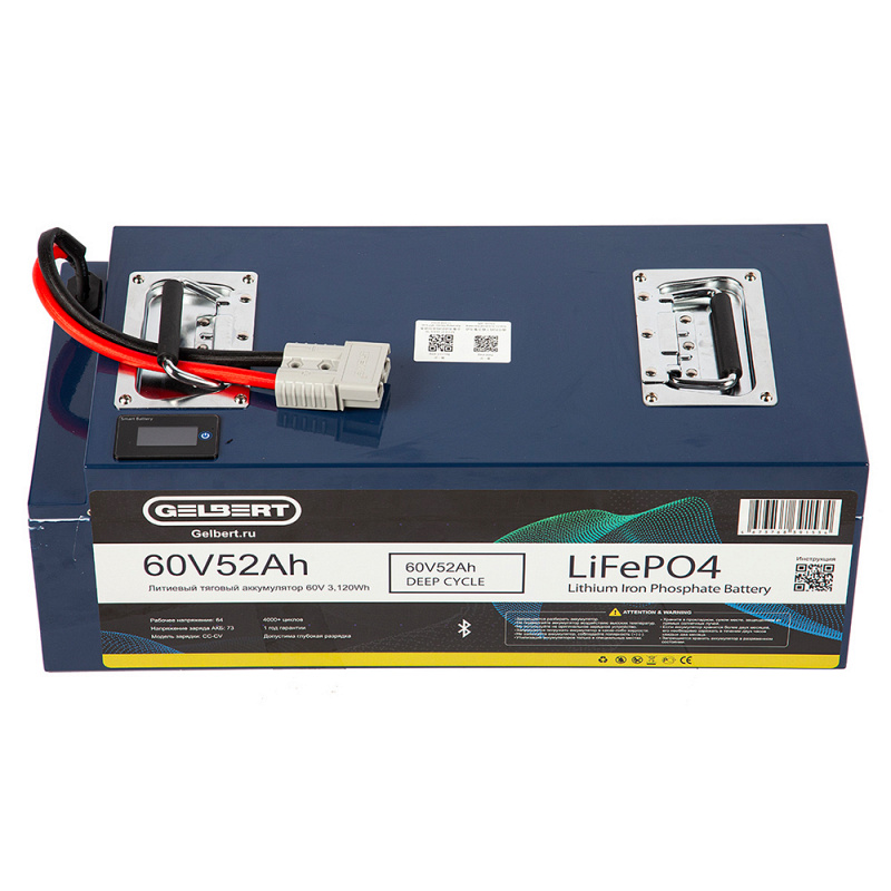 Тяговый литий-железо-фосфатный (LiFePO4) аккумулятор Gelbert LiFePO4 60В 52Ач производится напряжением 60 В и ёмкостью 52 Ач. Внутри корпуса установлена BMS (Battery Management System) плата, она контролирует процесс заряда и разряда акб, отслеживает её состояние и температуру. Срок службы тягового литиевого аккумулятора Gelbert LiFePO4 60В 52Ач составляет 12 лет в буферном режиме и более 4000 циклов при DoD не более 80% в циклическом режиме работы. Помимо малой массы и длительного срока эксплуатации Gelbert LiFePO4 60В 52Ач отличается от свинцово-кислотных работой при экстремальных условиях: батарею можно использовать при температуре до 55 °С.