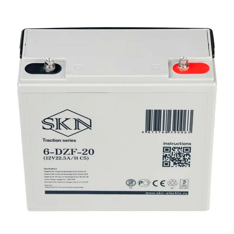 Свинцово-кислотный тяговый аккумулятор SKN 6-DZF-20 (ёмкость 28 Ач, напряжение 12 В) производится по технологии GEL и рекомендован для техники на электрической тяге. Электролит загущен до желеобразного состояния, благодаря чему батарея более устойчива к температурному воздействию и глубоким разрядам. Гелевые аккумуляторы отличаются повышенным числом циклов заряд-разряд: более 700 при DOD (глубине разряда) 80%. Пластины тягового аккумулятора снабжены более плотным активным материалом, благодаря этому они устойчивы к глубоким разрядам и не теряют ёмкость. Тяговый аккумулятор SKN 6-DZF-20 применяется в различной технике с электродвигателями. Корпус выполнен из ударопрочного ABS пластика и надёжно герметизирован. На крышке аккумулятора SKN 6-DZF-20 предусмотрен односторонний клапан избыточного давления. Дата производства аккумулятора SKN 6-DZF-20 указана на крышке в виде символьного кода.