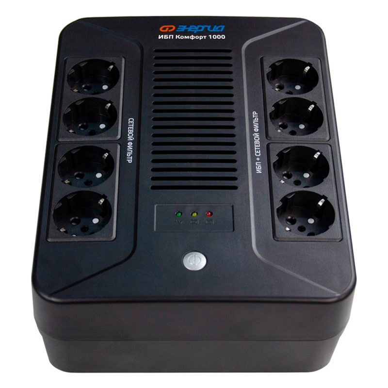 Однофазный линейно-интерактивный ИБП Энергия Комфорт 1000 (1000 ВА / 600 Вт) подходит для бытового использования, защиты ПК, периферийного оборудования, офисной техники. Компактный корпус подходит для напольной установки источника бесперебойного питания, его можно повесить вертикально, в любом положении он не займёт много места. Выводы выполнены в виде стандартных евро-розеток (Schuko), что позволяет подключать к однофазному ИБП Энергия Комфорт 1000 потребителей напрямую. Внутри источника бесперебойного питания установлен свинцово-кислотный AGM аккумулятор. Также предусмотрена система интеллектуального управления зарядом батареи. Для отслеживания состояния бесперебойника установлена светодиодная и звуковая индикация. Автоматический предохранитель защищает от коротких замыканий, перезаряда батарей, перегрузок и перенапряжений. Шум от системы воздушного охлаждения ИБП Энергия Комфорт 1000 не превышает 50 дБ.
