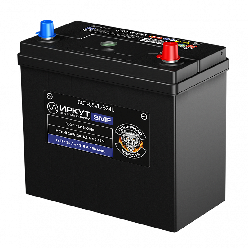 Автомобильный аккумулятор ИРКУТ 6CT-55VL-B24L (UHD-B24L) производится по технологии SMF (Super Maintenance Free) — улучшенный герметичный необслуживаемый свинцово-кислотный АКБ с VRLA клапаном и рекомбинацией газов. Такие батареи более долговечные, чем стандартные AGM и обладают более низким саморазрядом. Аккумулятор разработан с учетом конструктивных особенностей европейских, российских и американских автомобилей.
