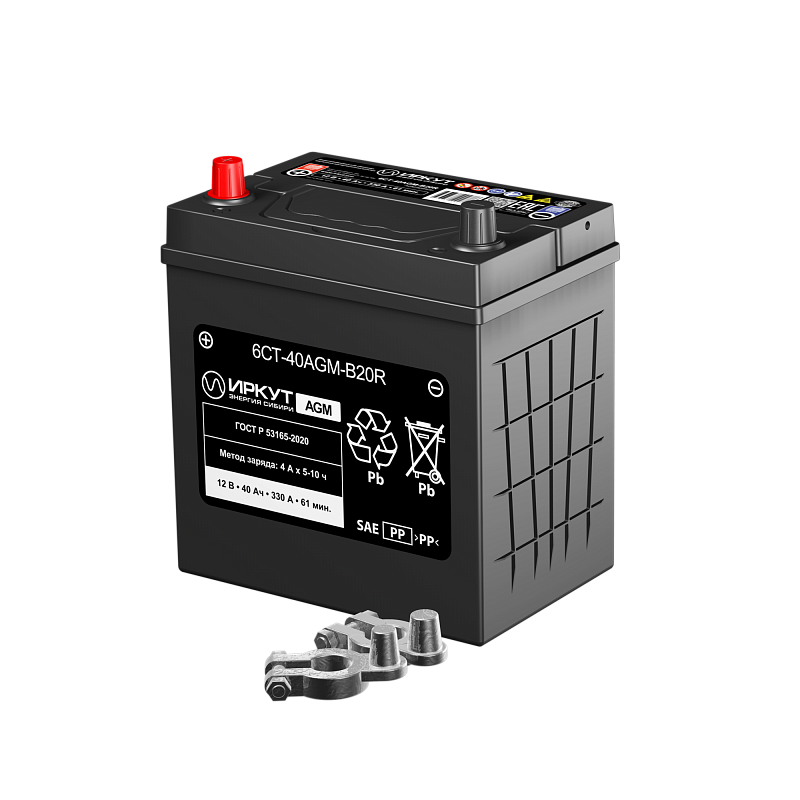 Автомобильный аккумулятор ИРКУТ 6СТ-40AGM-B20R выпускается напряжением 12 В, ёмкостью 40 Ач, стартерным током = 330 А, прямой полярностью и креплением B01. Батарея разработана для эксплуатации авто в городских условиях: короткие поездки и частые остановки. АКБ также подходит как вспомогательный аккумулятор для гибридных и электроавтомобилей азиатского производства или авто с системой Start-Stop. Он также может использоваться на стандартных автомобилях в качестве усиленной версии с увеличенным сроком службы и максимальной стойкостью к глубоким разрядам. Клеммы ИРКУТ 6СТ-40AGM-B20R производятся в исполнении Т1 (стандартные), также в комплекте идут адаптеры под Т3 (узкие).