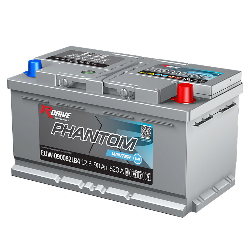 Автомобильный аккумулятор RDrive PHANTOM WINTER SMF EUW-090082LB4 производится напряжением 12 В, ёмкостью 90 Ач, током холодной прокрутки = 820 А для европейских автомобилей, эксплуатирующихся в условиях холодного климата северных регионов Сибири и Дальнего Востока. Клеммы стандартные, полярность обратная (- +). RDrive PHANTOM WINTER SMF EUW-090082LB4 в сравнении со стандартными свинцово-кислотными аккумуляторами обладает повышенной производительностью и устойчивостью к вибрациям, что существенно продлевает срок службы АКБ. Батареи серии PHANTOM модификации Winter разработаны для суровых климатических условий. Ключевая особенность батареи — повышенный пусковой ток и усиленная конструкция.