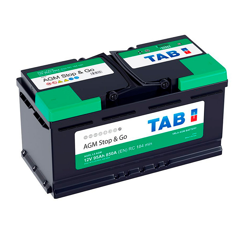 Автомобильный аккумулятор TAB AGM STOP&GO 95 обр (L5.0) производится по технологии AGM (Absorbent Glass Mat) напряжением 12 В, ёмкостью 95 Ач, стартерным током 850 А с обратной полярностью для европейских автомобилей с поддержкой функции Start-Stop. Батарея изготавливается из высококачественных материалов и относится к премиум сегменту. Циклический ресурс АКБ TAB AGM STOP&GO 95 обр (L5.0) втрое выше, чем у стандартных свинцово-кислотных батарей, это достигается благодаря предотвращению осыпания активного вещества и обеспечивает большей зарядки без потери функциональности. Стартерные токи выше на 30% за счёт более полного использования объёма элементов при запуске. Обслуживать TAB AGM STOP&GO 95 обр (L5.0) не требуется, внутри корпуса поддерживается давление, достаточное для протекания реакции рекомбинации газов, таким образом расход воды в электролите минимизирован.