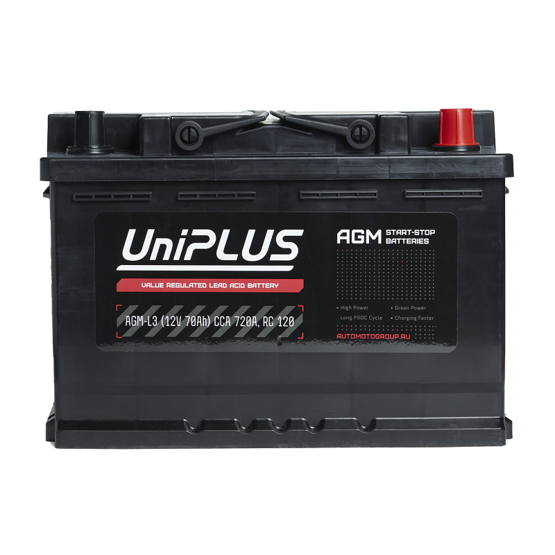 Автомобильный аккумулятор UniPLUS AGM-L3 производится напряжением 12 В, ёмкостью 70 Ач и стартерным током (пусковым током) 720 А с поддержкой системы запуска двигателя Start-Stop. Клеммы выполнены в виде стандартного конуса B13, полярность — обратная (-/+). UniPLUS AGM-L3 изготавливается по технологии AGM: жидкий электролит удерживается в неподвижном состоянии благодаря мелкопористым стекловолоконным сепараторам. Это положительно сказывается как на сроке службы, так и на устойчивости к воздействию вибрации и температуры. Герметичный корпус UniPLUS AGM-L3 выполнен из высокопрочного пластика, клапан избыточного давления сбрасывает избыток газов и поддерживает необходимое для их рекомбинации давление. Изготовление решёток по технологии punch-grid обеспечивает вдвое больший по сравнению со стандартными свинцово-кислотными аккумуляторами срок службы. UniPLUS AGM-L3 сохраняет высокие пусковые токи даже при экстремальных температурах: от -40 до +55 °C.