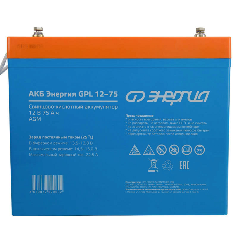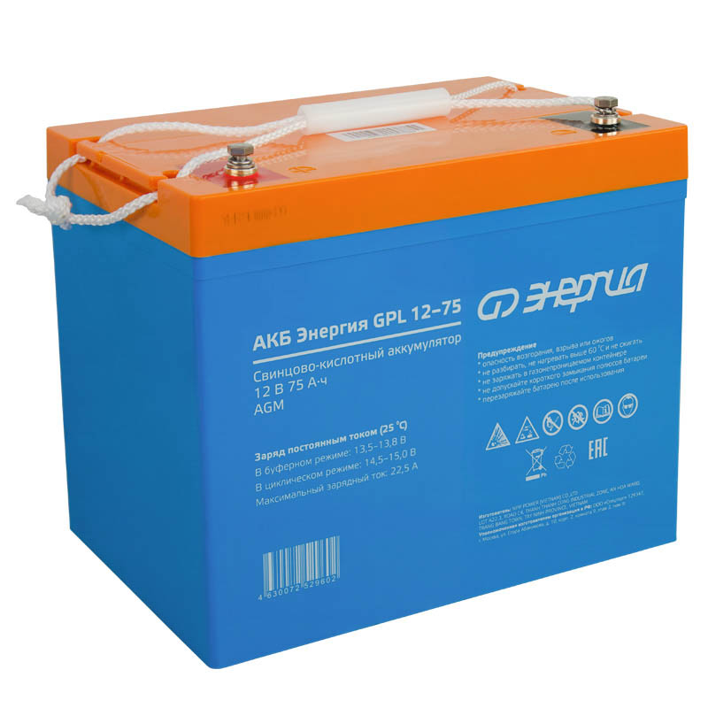Свинцово-кислотный аккумулятор Энергия GPL 12–75 производится напряжением 12 В и ёмкостью 75 Ач по технологии AGM. Стекловолоконный сепаратор обеспечивает неподвижность электролита, что положительно сказывается на характеристиках батареи. Срок службы при соблюдении правил эксплуатации достигает 12 лет в буферном режиме. Энергия GPL 12–75 подходит для использования в источниках бесперебойного питания, охранной и пожарной сигнализации, систем связи и телекоммуникации. Корпус из ABS пластика прочный и надёжно герметизирован. На протяжении всего срока службы обслуживание (долив дистиллята) не требуется.
