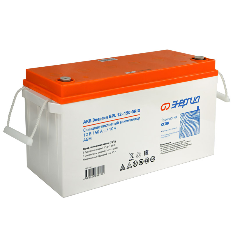 Свинцово-кислотный аккумулятор Энергия GPL 12–150 GRID (12 В, 150 Ач) производится по технологии AGM. В отличии от стандартных батарей он обладает сверхпрочной решёткой с высокой электропроводимостью. Это повышает устойчивость пластин к коррозии и срок службы: до 12 лет при соблюдении правил эксплуатации. Благодаря особому методу соединения блоков (TTR) снижено внутреннее сопротивление аккумулятора и увеличивает энергоэффективнность, позволяя пропускать более высокие токи. Энергия GPL 12–150 GRID подходит для электропитания устройств охранной и пожарной сигнализации, информационных и телекоммуникационных систем.
