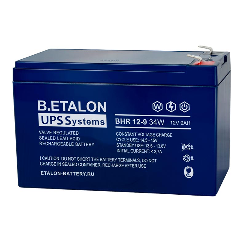 Свинцово-кислотный аккумулятор B.ETALON BHR 12-9 34W выпускается ёмкостью 9 Ач и напряжением 12 В. Он может использоваться как в циклическом, так и в буферном режиме. Батарею можно использовать в источниках бесперебойного питания, медицинском оборудовании, ЦОД, системах связи и других подобных системах. B.ETALON BHR 12-9 34W полностью герметичен, внутреннее давление регулируется специальным VRLA (Valve-Regulated Lead–Acid) клапаном. Благодаря нему внутри аккумулятора происходит рекомбинация газов и обслуживание на протяжении всего срока службы изделия (до 6 лет) не требуется. Продукт сертифицирован для использования на территории РФ и соответствует требованиям UL, IEC, Гост Р. Главная особенность линейки аккумуляторов B.ETALON повышенная энергоотдача. Она достигается благодаря специальной технологии изготовления свинцовых пластин.