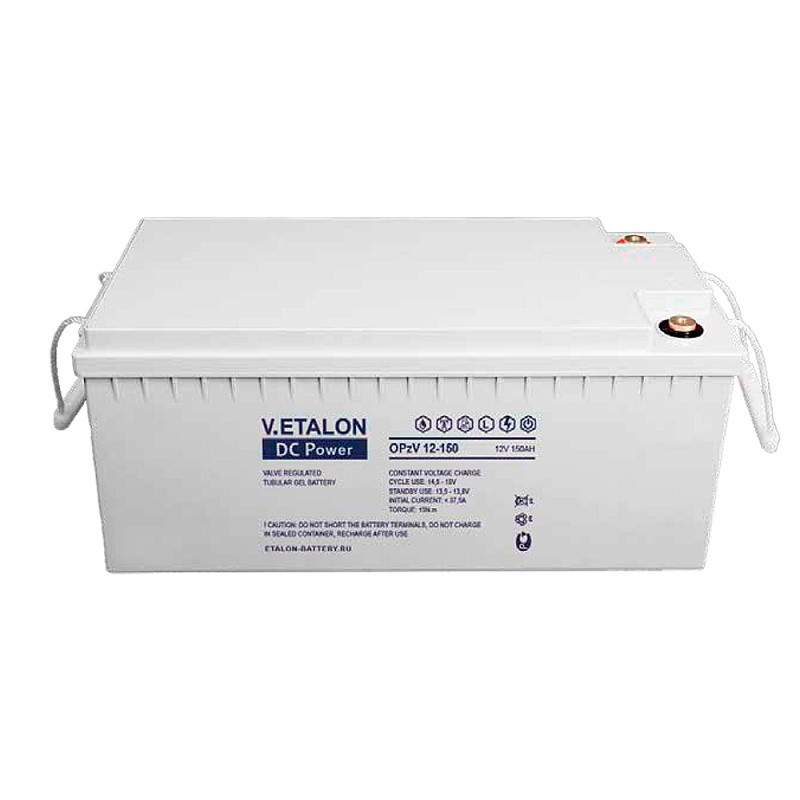 Промышленный свинцово-кислотный аккумулятор V.Etalon 12-150 производится напряжением 12 В и ёмкостью 150 Ач. Электролит загущен до состояния геля (GEL), это обеспечивает повышенную устойчивость к глубоким разрядам, воздействию температур (от -45 до +65 °C) и повышает ресурс при циклическом использовании. Срок службы аккумулятора с гелеобразным электролитом составляет более 20 лет или 1500+ циклов при DoD = 80%. Корпус V.Etalon 12-150 надёжно герметизирован, внутри поддерживается давление, благодаря которому происходит рекомбинация газов. Избыточное давление сбрасывается через VRLA-клапан.
